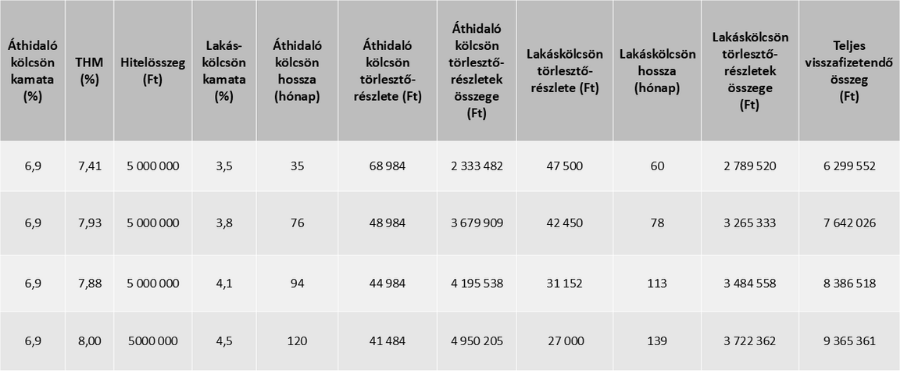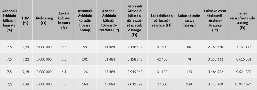 - Maximum 12,5 millió forint szerződéses összeg esetén 10 év (5 év azonnali áthidaló kölcsön időszak + max. 5 év lakáskölcsön törlesztési időszak)
